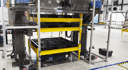 ④ 必要に応じて空コタツをコタツスタッカー装置で段バラシし指定の場所までAGV搬送