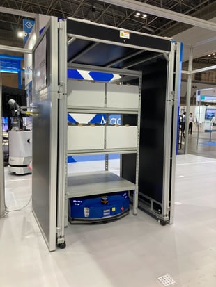 多様なモノづくりの現場で活用されている「からくり棚」を、リフト型AGV「TiTra G-500」が搬送します。