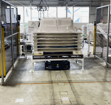 LIXIL上野緑工場では、エリア内にユニットバス用の浴槽や床材が保管されており、システムからの指示に応じて適切なタイミングで出庫・入庫を行う必要があります。従来は、従業員によるハンドパレットを用いた搬送が行われていましたが、移動距離と重量物の搬送負荷を軽減するため、 「TiTra G1000」を用いた自動化を導入しました。